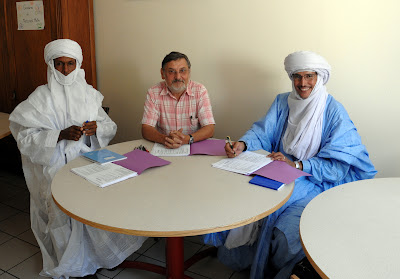 Billou Mohamed Moctar (président d’ONODEP et directeur administratif de l’école TANAT ) et Rissa Mohamadou (directeur académique de l’école TANAT) préparent l’ouverture de l’école TANAT en octobre prochain, avec Bruno Grillet (directeur du primaire de l’école Bayard de Grenoble) dans le cadre du partenariat pédagogique et technique établi entre les deux écoles.